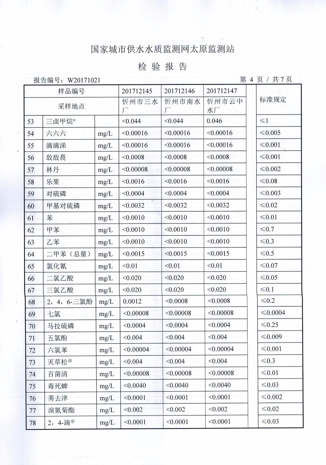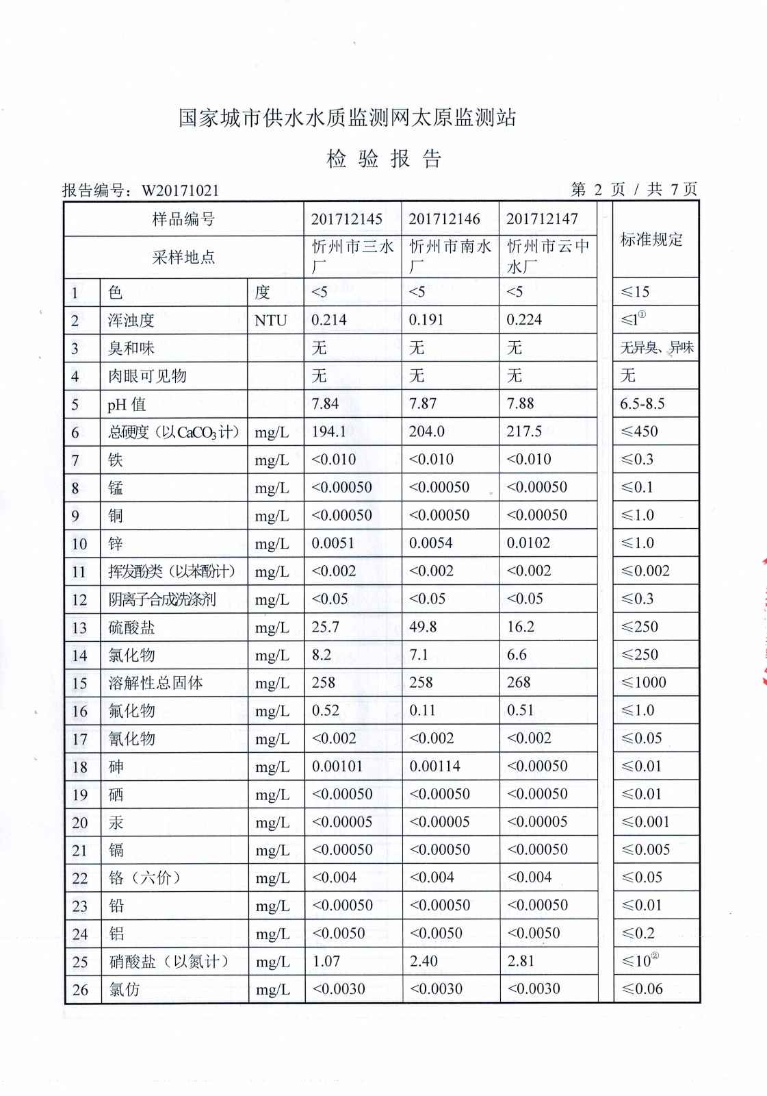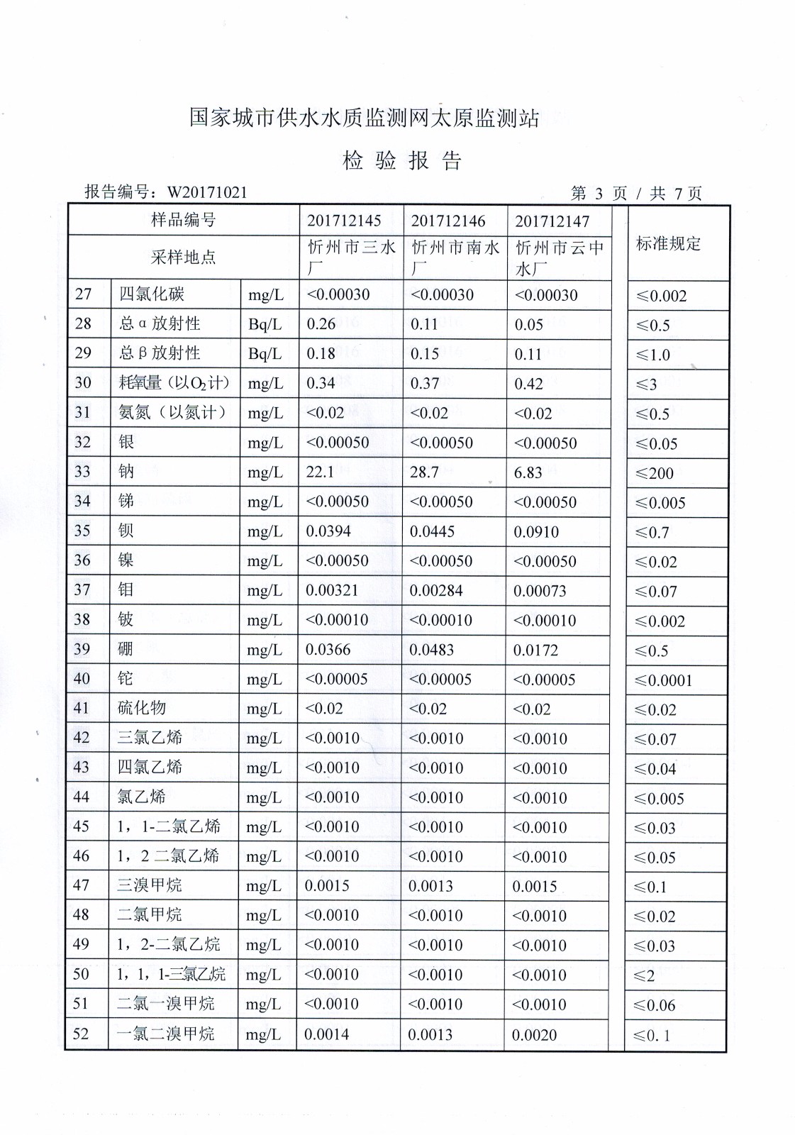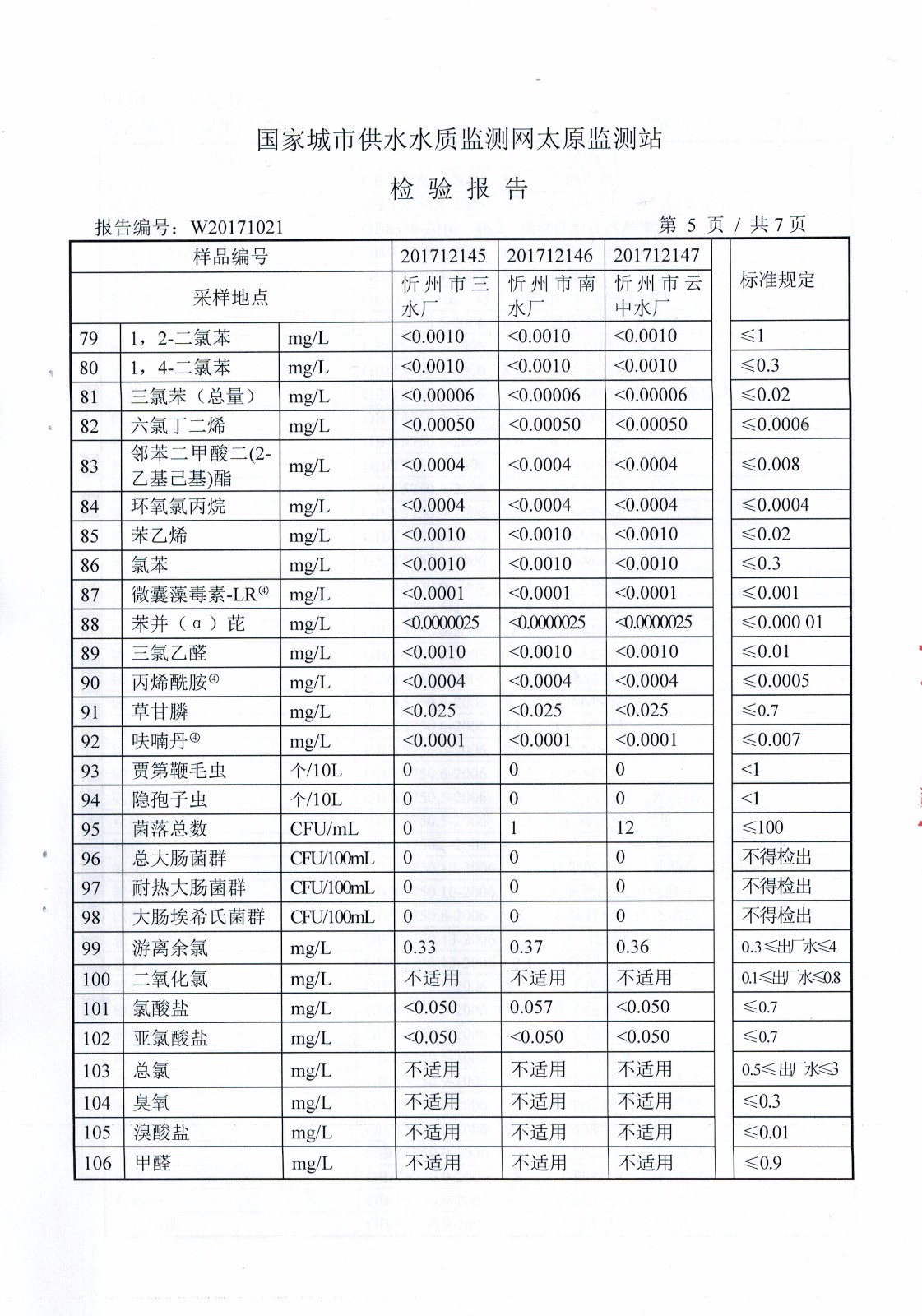 2017年忻州城區公共供水南水廠、三水廠、云中水廠出廠水106項水質全分析