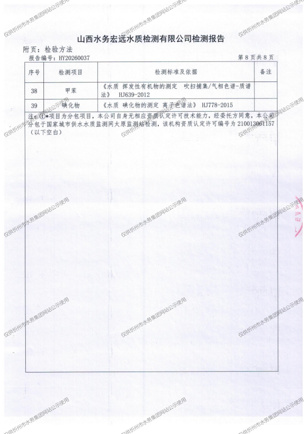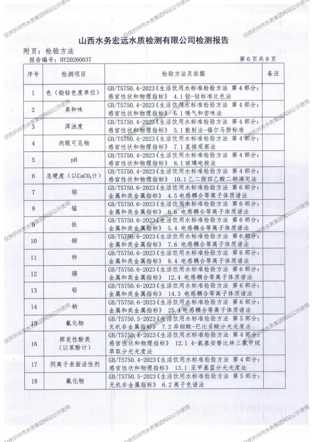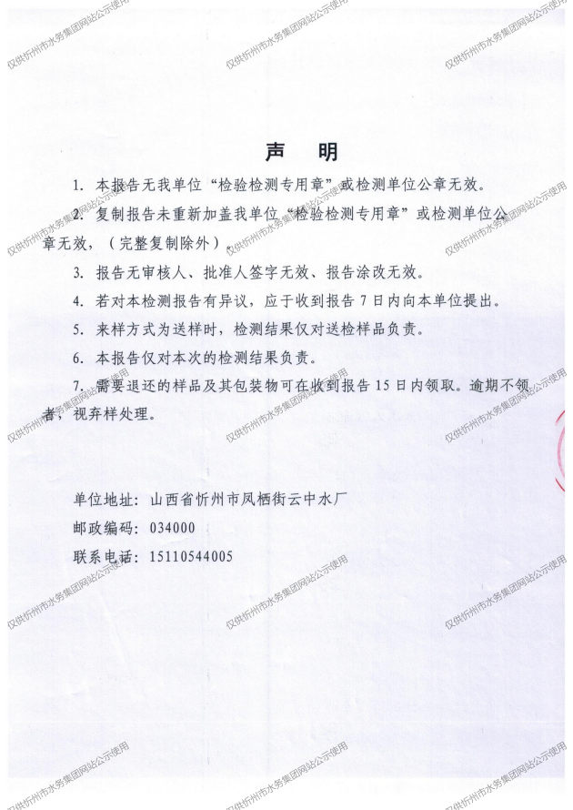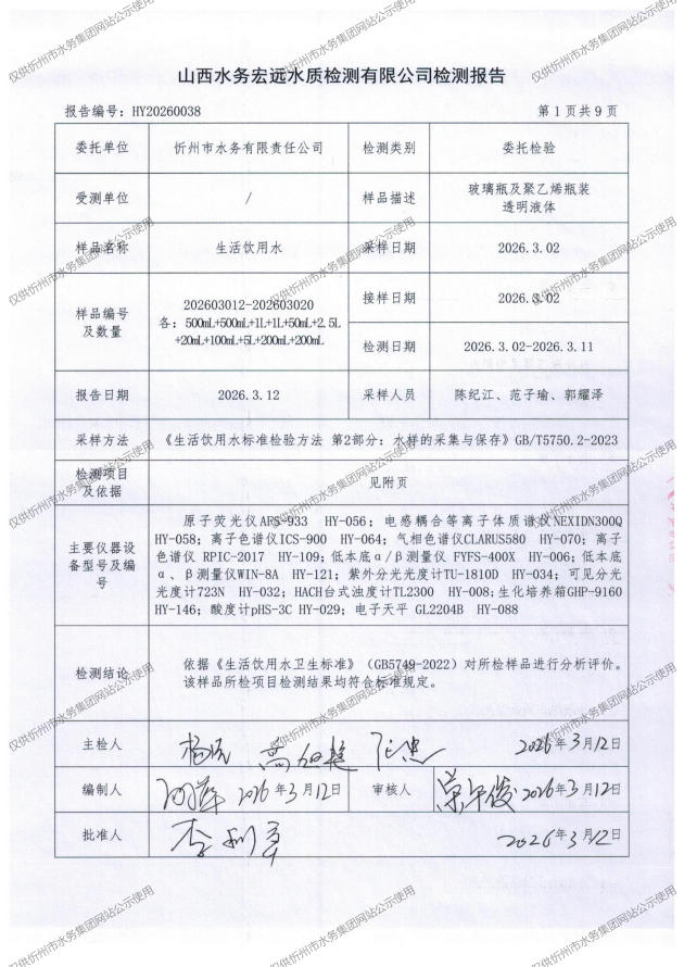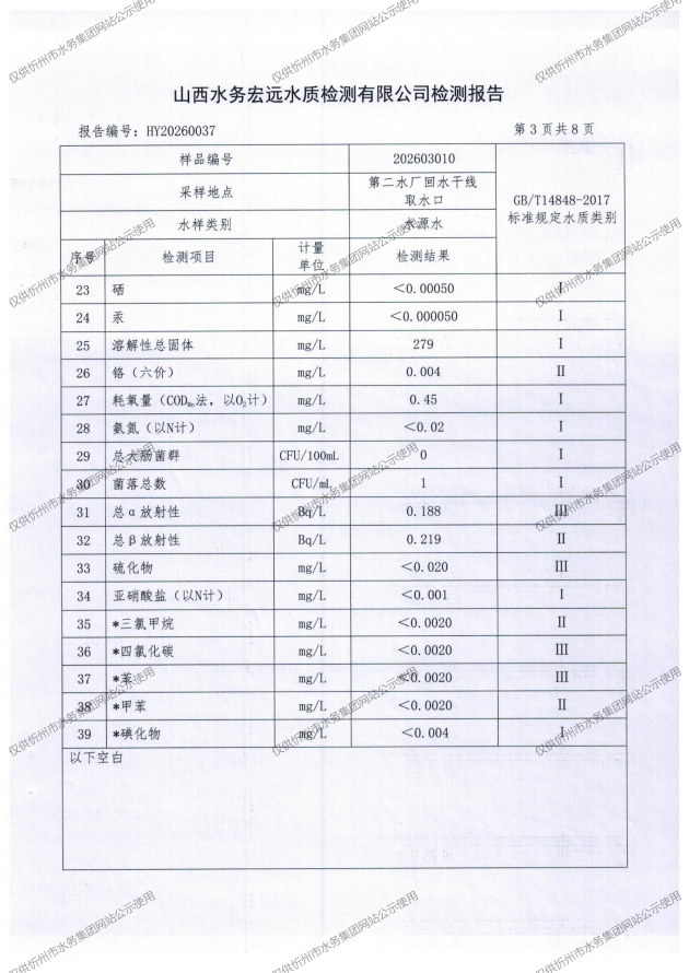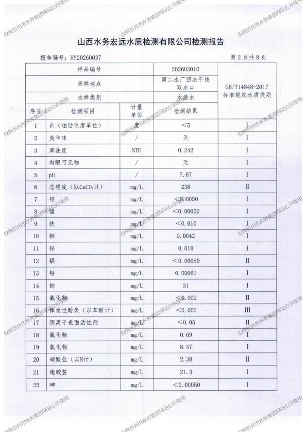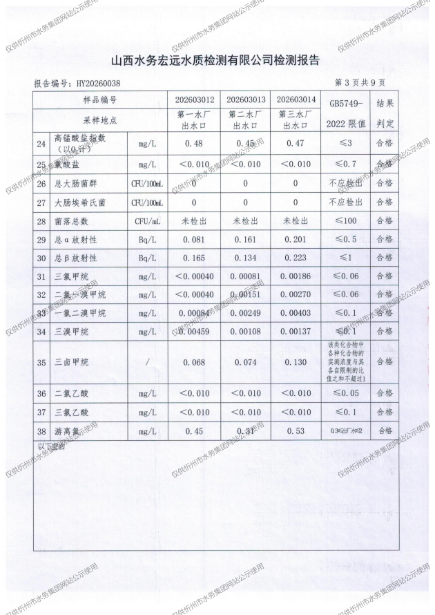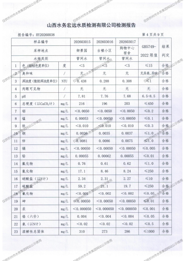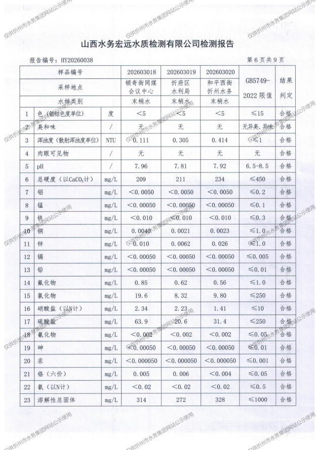 忻州城區公共供水水源水、出廠水、管網水、管網末梢水2026年3月份水質信息公示
