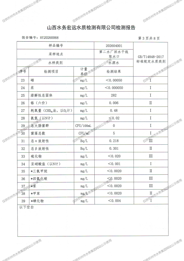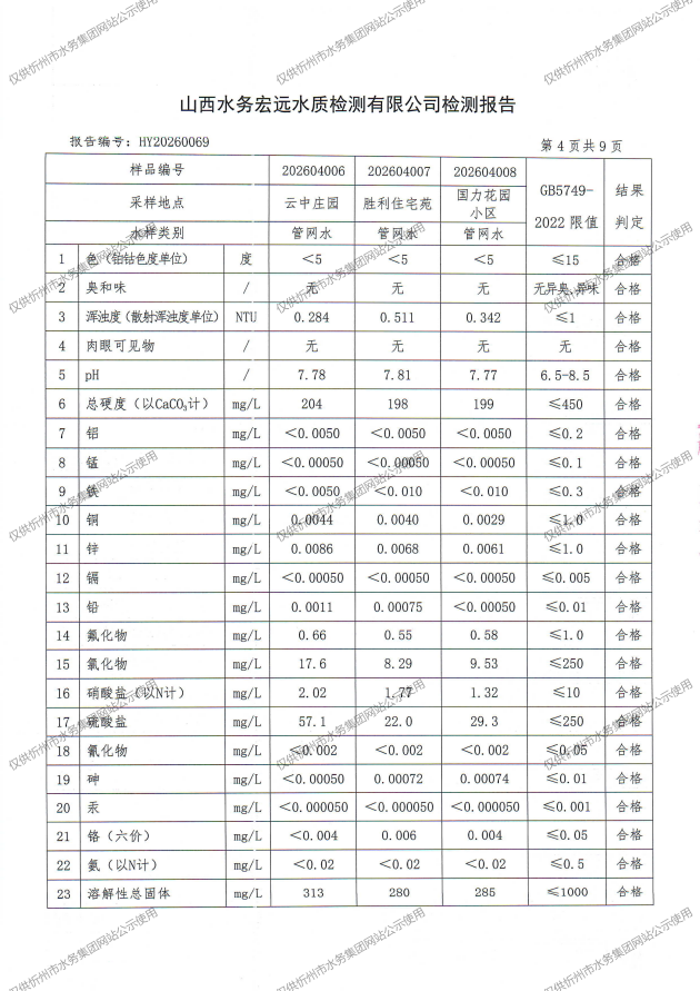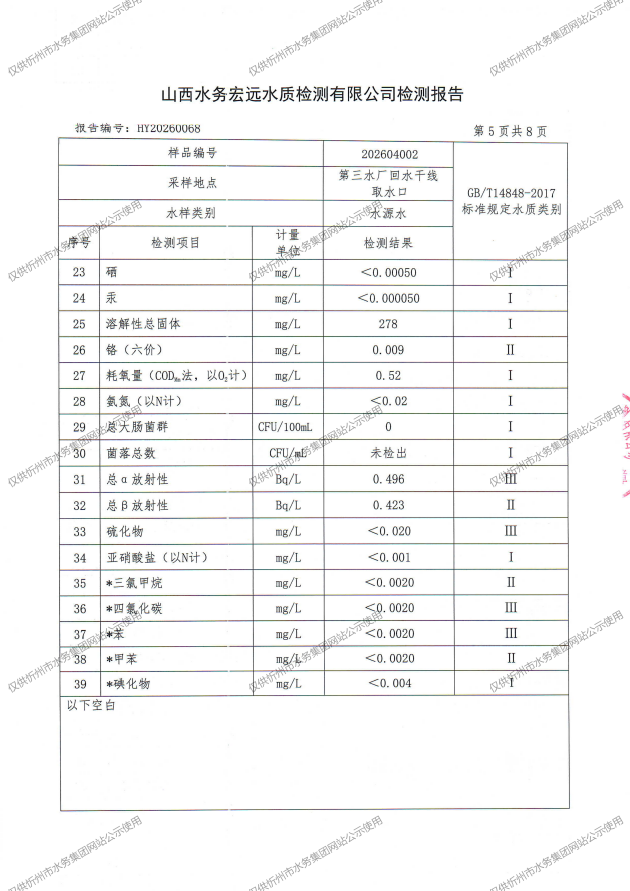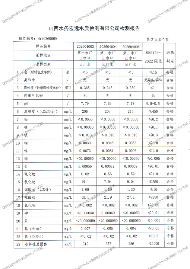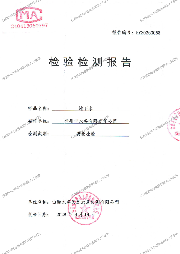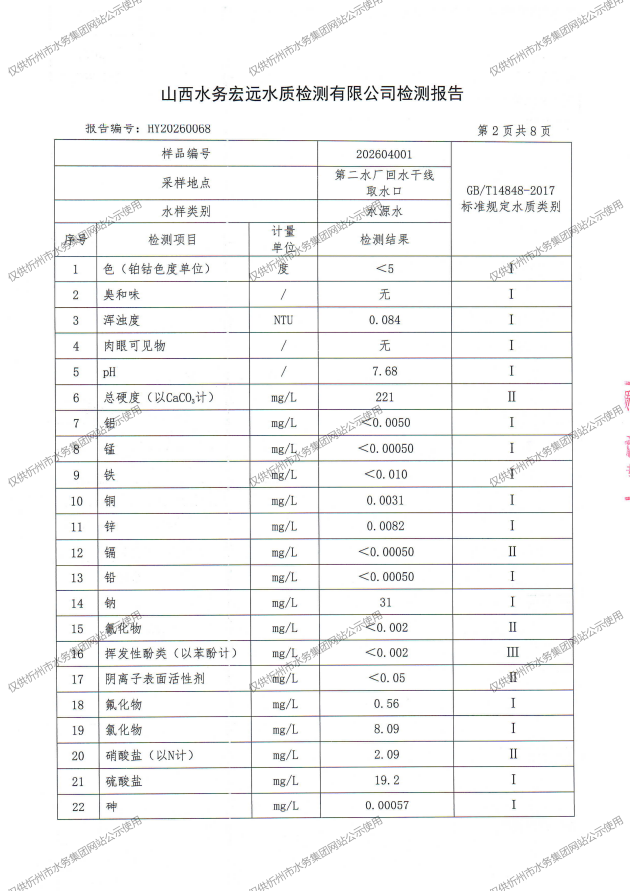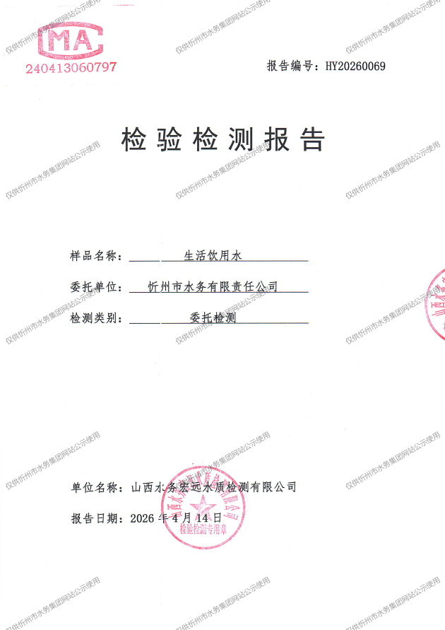 忻州城區(qū)公共供水水源水、出廠水、管網(wǎng)水、管網(wǎng)末梢水2026年4月份水質(zhì)信息公示