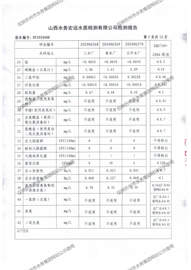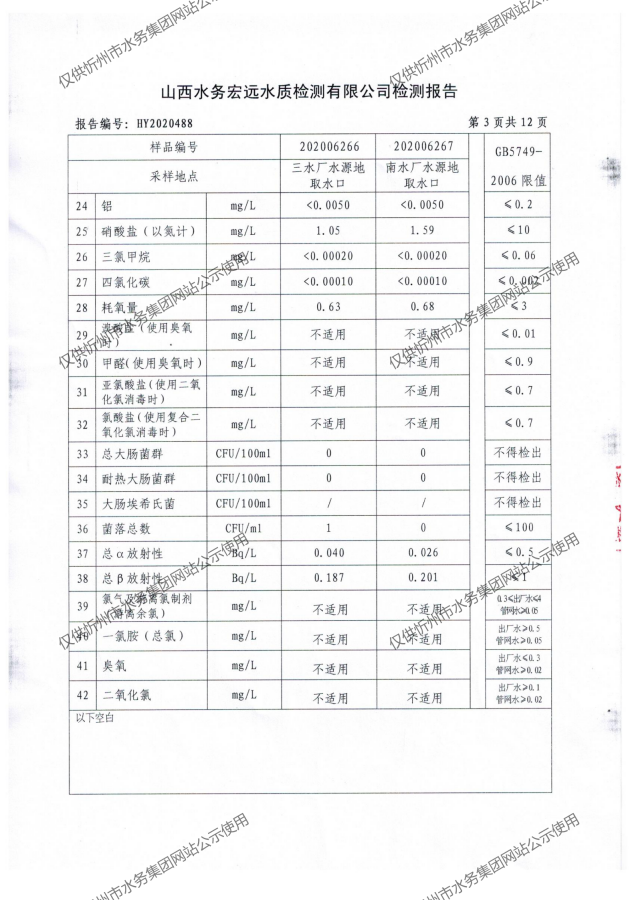 忻州城區公共供水水源水、出廠水、管網水、管網末梢水2020年7月份水質信息公示
