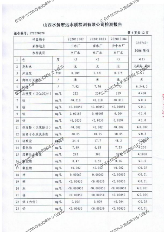 忻州城區(qū)公共供水水源水、出廠水、管網(wǎng)水、管網(wǎng)末梢水2020年10月份水質(zhì)信息公示