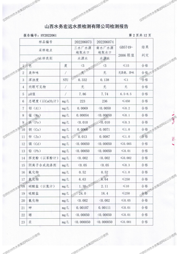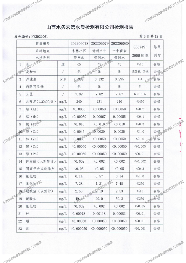 忻州城區公共供水水源水、出廠水、管網水、管網末梢水2022年6月份水質信息公示