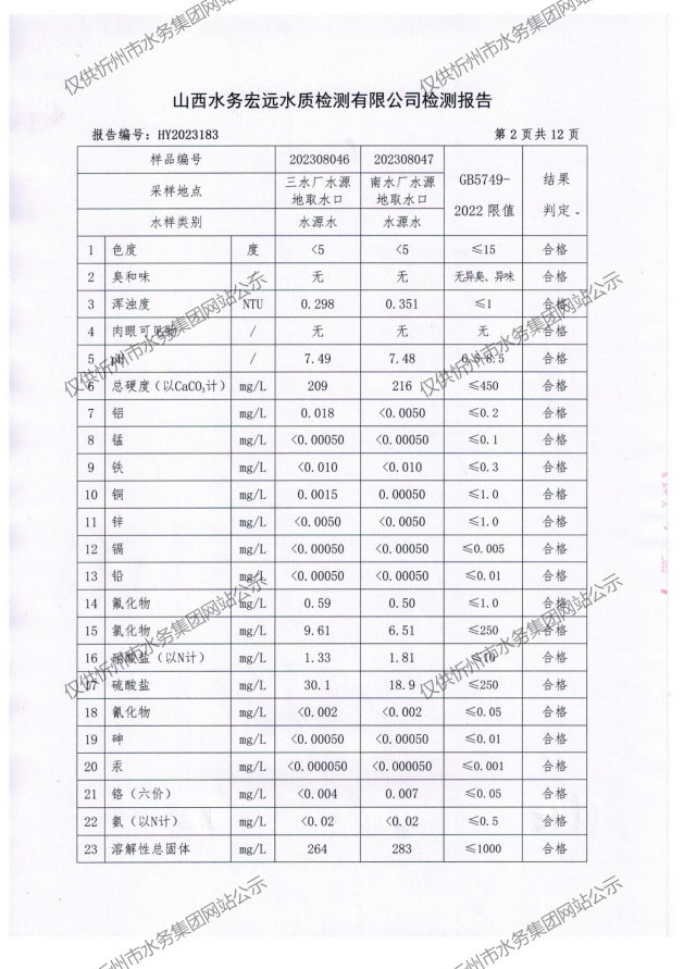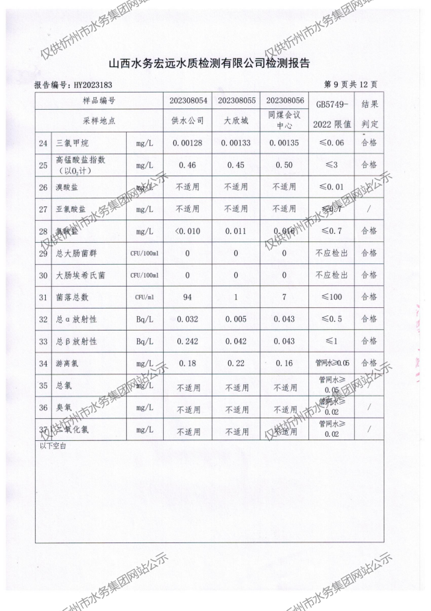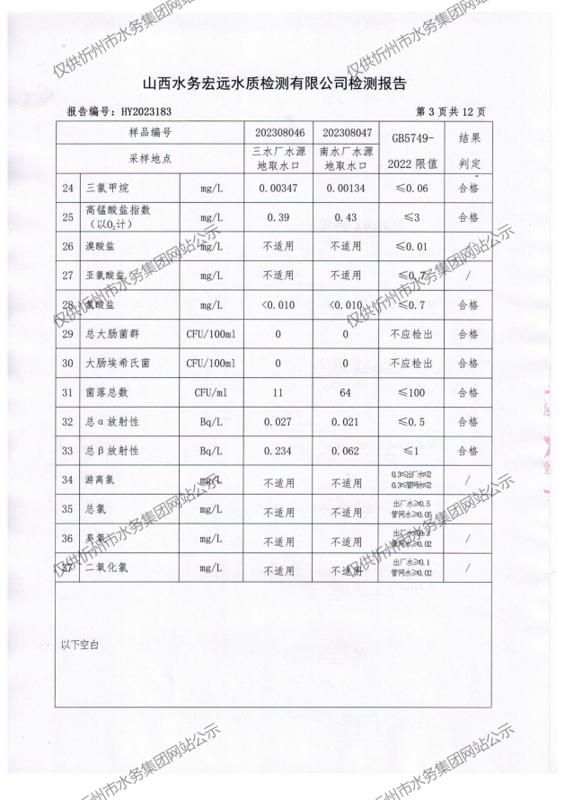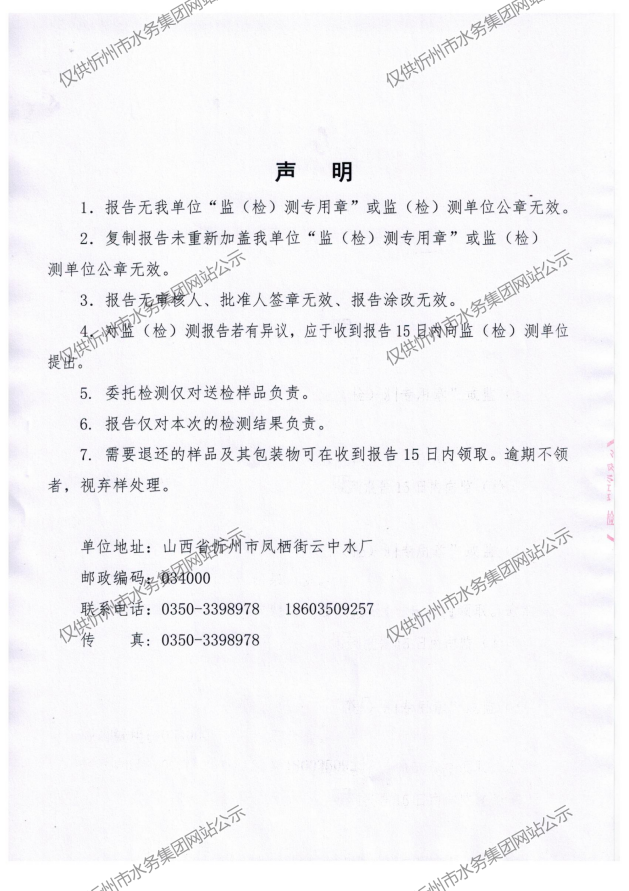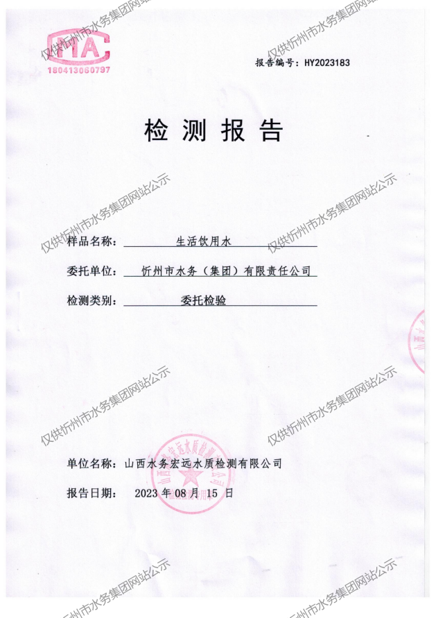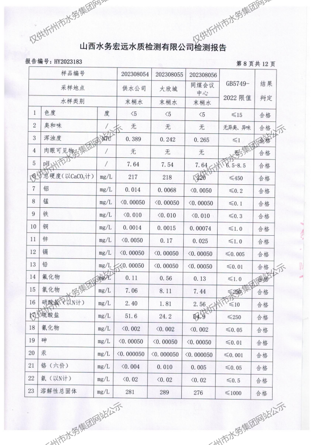忻州城區公共供水水源水、出廠水、管網水、管網末梢水2023年8月份水質信息公示
