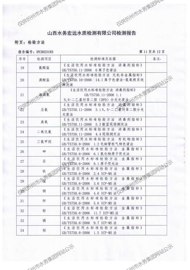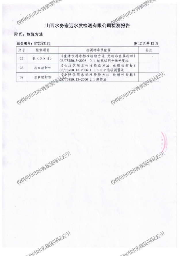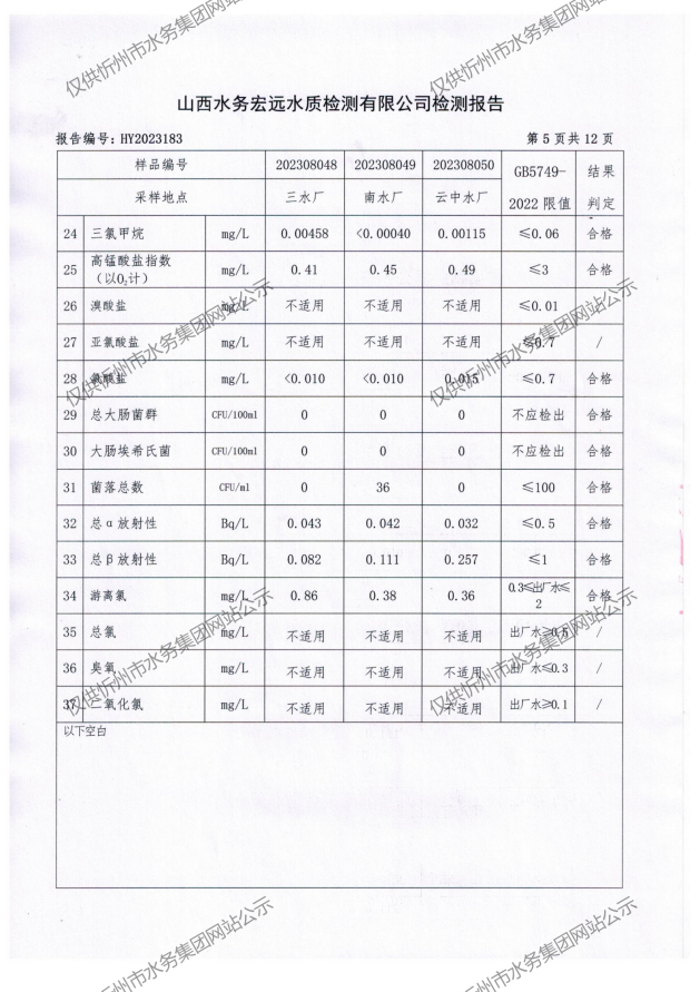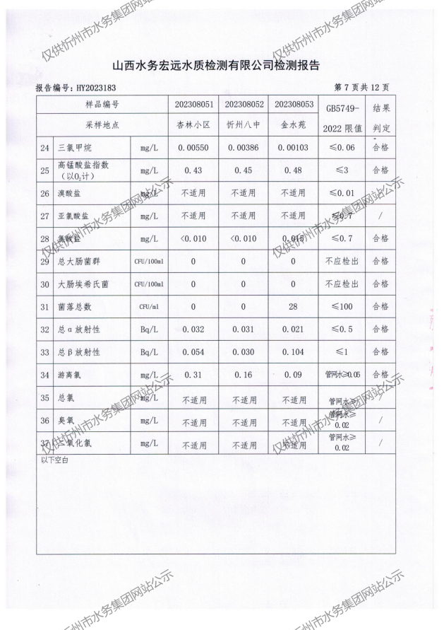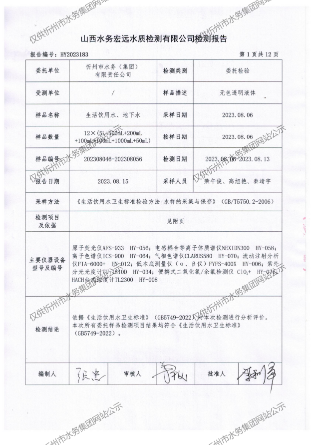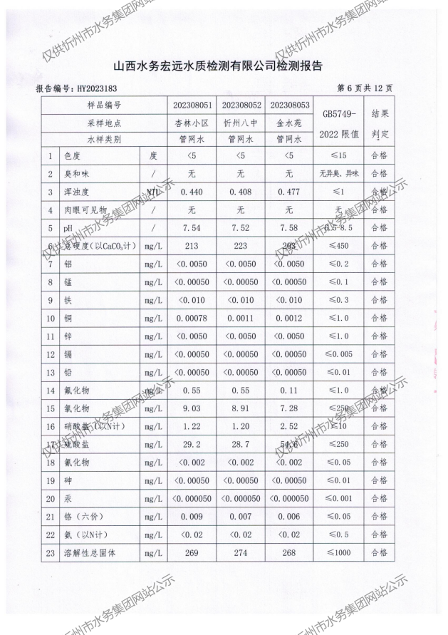 忻州城區公共供水水源水、出廠水、管網水、管網末梢水2023年8月份水質信息公示