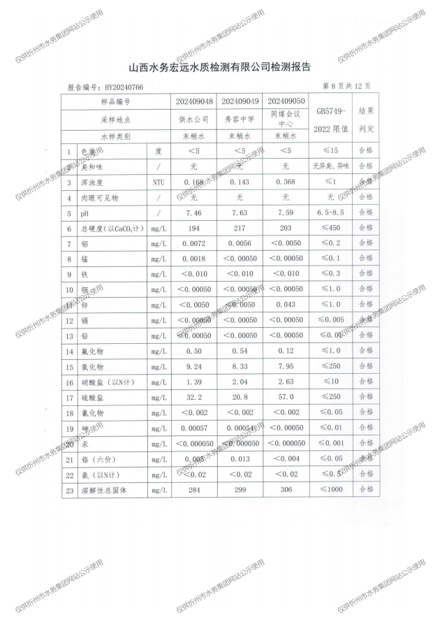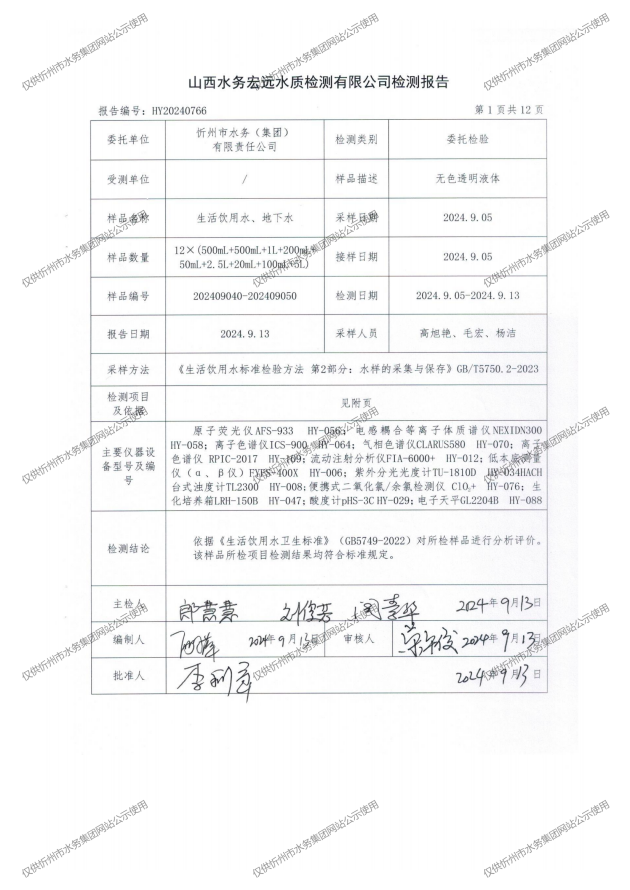 忻州城區公共供水水源水、出廠水、管網水、管網末梢水2024年9月份水質信息公示